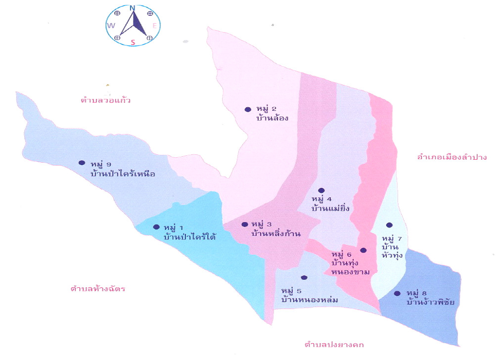 ทิศตะวันตก ติดต่อกับพื้นที่ ตำบลห้างฉัตร และตำบลวอแก้ว